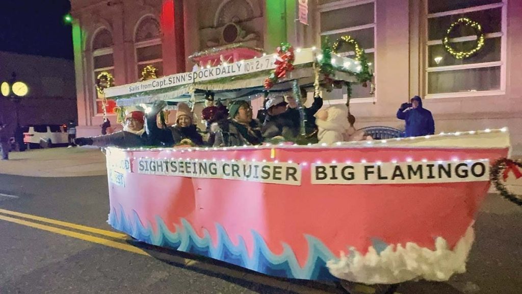 Adding to the magic, Charles Eyster arranged for two retired sea captains—Chuck Schumann of the Sightseer and Captain Sinns of the Big Flamingo, to pilot the floats during the parade. With the frigid winter temperatures however, Capt. Sinns was unable to make it out.